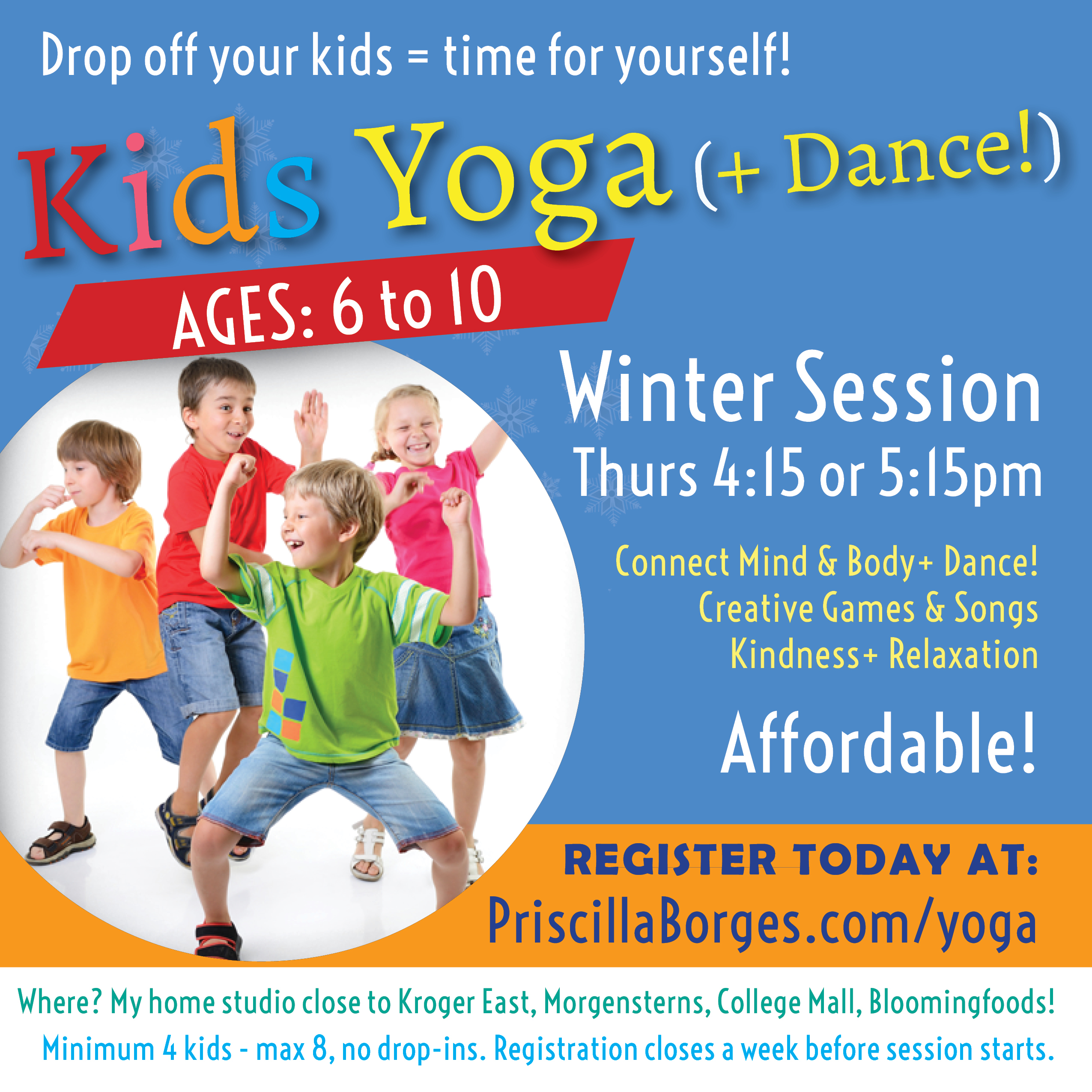 Priscilla’s kids yoga class has a little bit of everything: breathing & mindfulness, warm ups, strengthening and balancing poses, DANCE (new!), sequences adapted for kids, creative games, favorite kids songs, partner yoga, and always relaxation in the end. Read complete details in the Programs page.